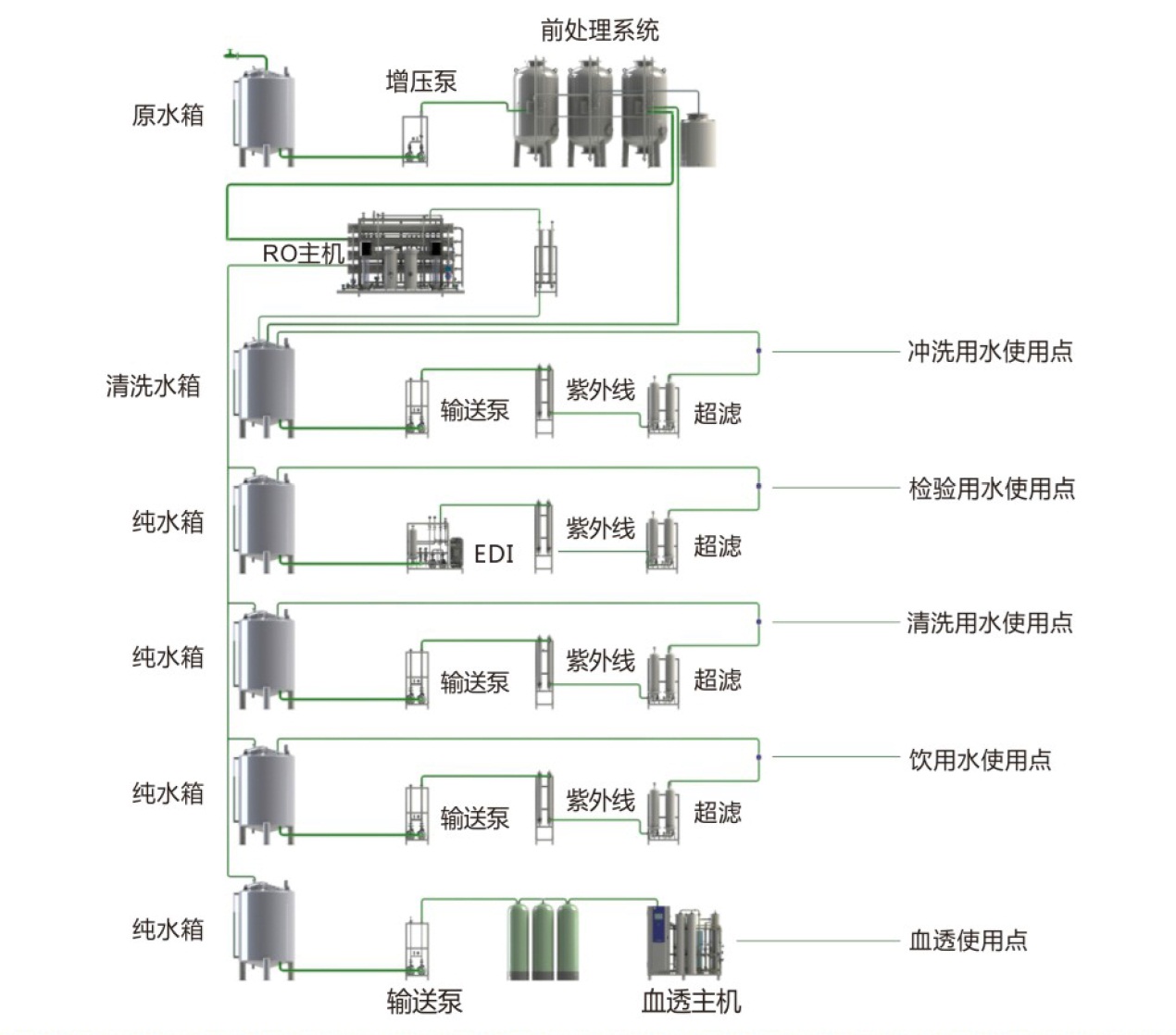 所謂中央集中制水、分質(zhì)供水,就是用一套水機(jī)對(duì)自來(lái)水進(jìn)行深度處理,使其達(dá)到各科室可直接使用的水質(zhì)標(biāo)準(zhǔn),再分別用管網(wǎng)供給各科室使用。我國(guó)自20世紀(jì)末引進(jìn)并實(shí)施了中央集中制水、分質(zhì)供水的理念和方案。近年來(lái),中央集中制水、分質(zhì)供水系統(tǒng),因其獨(dú)特的優(yōu)勢(shì)正在快速替代原有的獨(dú)立供水設(shè)備。