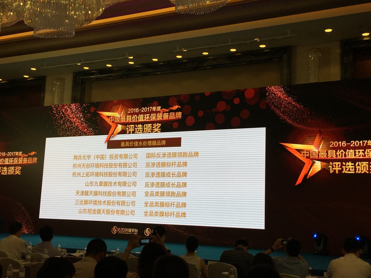 2017年8月23日,由上海市政工程設計研究總院(集團)有限公司、上海城投污水處理有限公司、E20環境平臺共同主辦的2017(第九屆)上海水業熱點論壇在上海隆重舉行,現場揭曉了“2016-2017”年度中國環保裝備品牌的評選結果。天創環境憑借二十年的積累與沉淀,榮膺 “2016-2017”年度中國最具價值環保裝備品牌——水處理膜品牌。