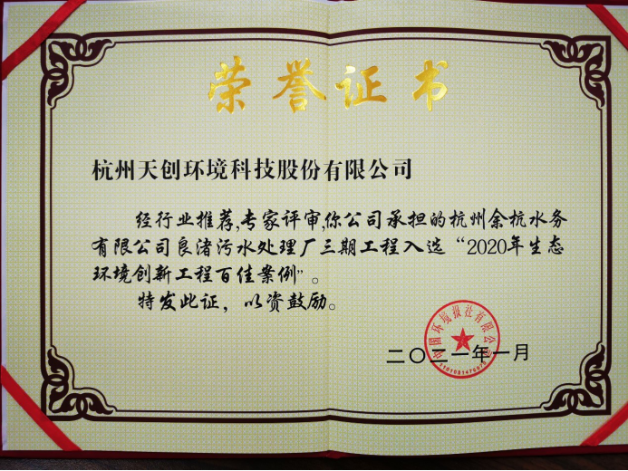 2021年伊始,由國家生態(tài)環(huán)境部主管、中國環(huán)境報(bào)社主辦的“2020年生態(tài)環(huán)境創(chuàng)新工程百佳案例”入選名單發(fā)布。杭州天創(chuàng)環(huán)境科技股份有限公司建設(shè)與運(yùn)營的“浙江省杭州市良渚污水處理廠三期工程”成功入選全國百佳工程案例。