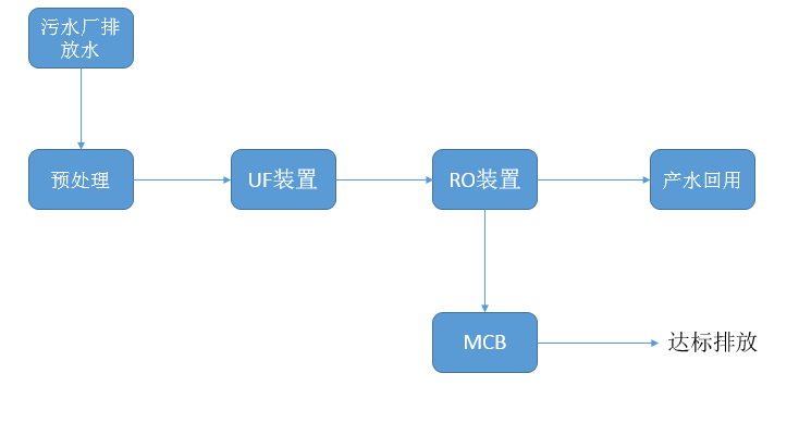 本工藝采用天創自主研發的壓力式PVDF中空纖維超濾膜和低能耗反滲透膜,雙膜工藝結合MCB工藝,應用于污水處理廠排放污水的再生回用。經過處理后的污水可達工業自來水的指標,膜濃水達到一級A的排放標準。