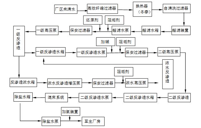 2)預脫鹽系統主要采用兩級反滲透技術用于去除水中各種溶解固形物即鹽分;
