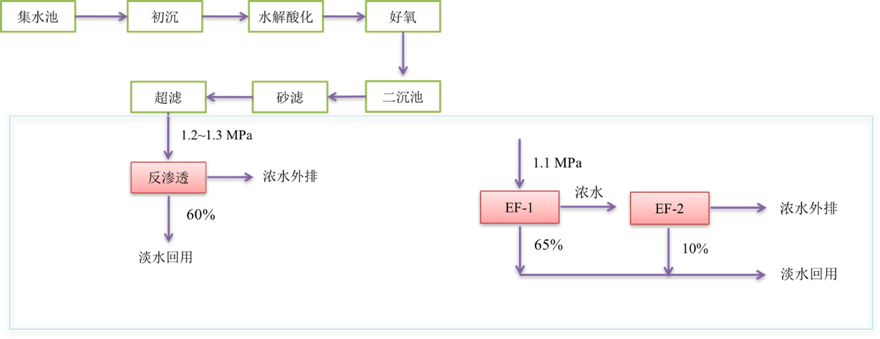 杭州易膜環(huán)保則根據(jù)中水回用需求,針對性開發(fā)兩款節(jié)能膜產(chǎn)品EF-1、EF-2,替代常規(guī)的反滲透膜組件。我國是紡織印染大國,每年約有6~7億噸印染廢水排入水環(huán)境中,占整個工業(yè)廢水排放量的35%,因此我公司選用印染廢水作為回用試驗進水,在回用流程基礎(chǔ)上,使用EF-1替代原先的反滲透膜組件,有效降低運行壓力至1.1 MPa、提升系統(tǒng)回收率至65%;同時,將EF-1濃水側(cè)直接與EF-2膜組件相連,利用EF-1膜組件系統(tǒng)濃水殘留的驅(qū)動力,進一步獲得10%的產(chǎn)水,即將整體系統(tǒng)廢水排放率由初始的40%減少為25%。由于該工藝只增加了EF-2膜組件系統(tǒng),免除中間水箱、增壓泵及高壓泵等輔助設(shè)備,所需投資成本有限。