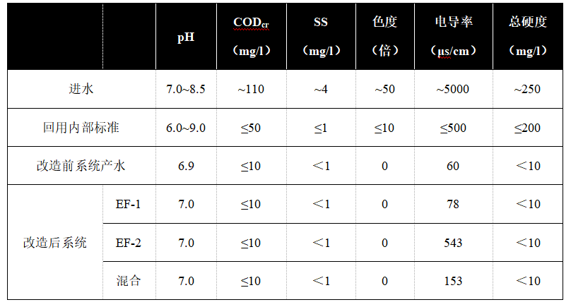 表更換節(jié)能膜前后回用系統(tǒng)產(chǎn)水水質(zhì)參數(shù)